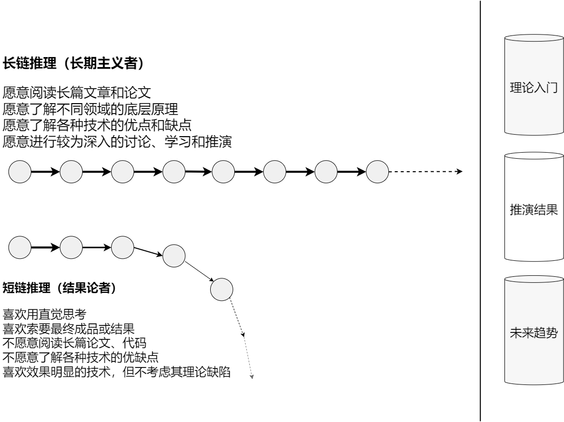 直觉或短链推理判断是非,很少进行长链推理,也不相信长链推理的潜在效用,只相信看得见的实验结果或数据。 - 对效果明显的技术非常感兴趣,但不考虑其理论上限和潜在缺陷。